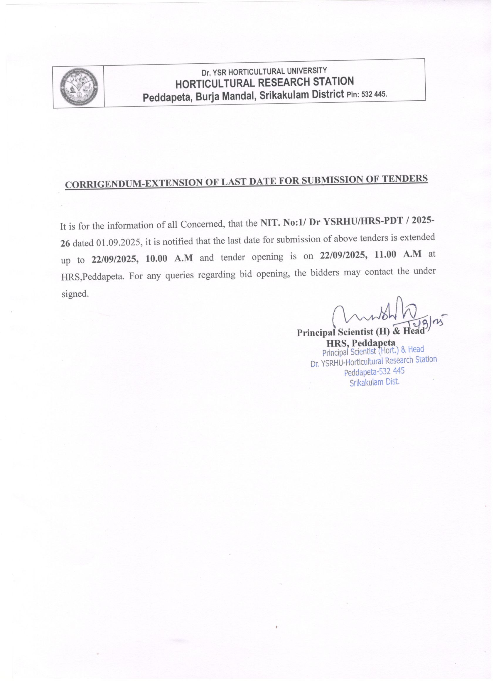 EXTENSION OF LAST DATE FOR SUBMISSION OF BID DOCUMENT FOR SUPPLY AND INSTALLATION OF EQUIPMENT AT HORTICULTURAL RESEARCH STATION- MADANAPALLI -517326 ANNAMAYYA DISTRICT Published on 15 September 2025 |